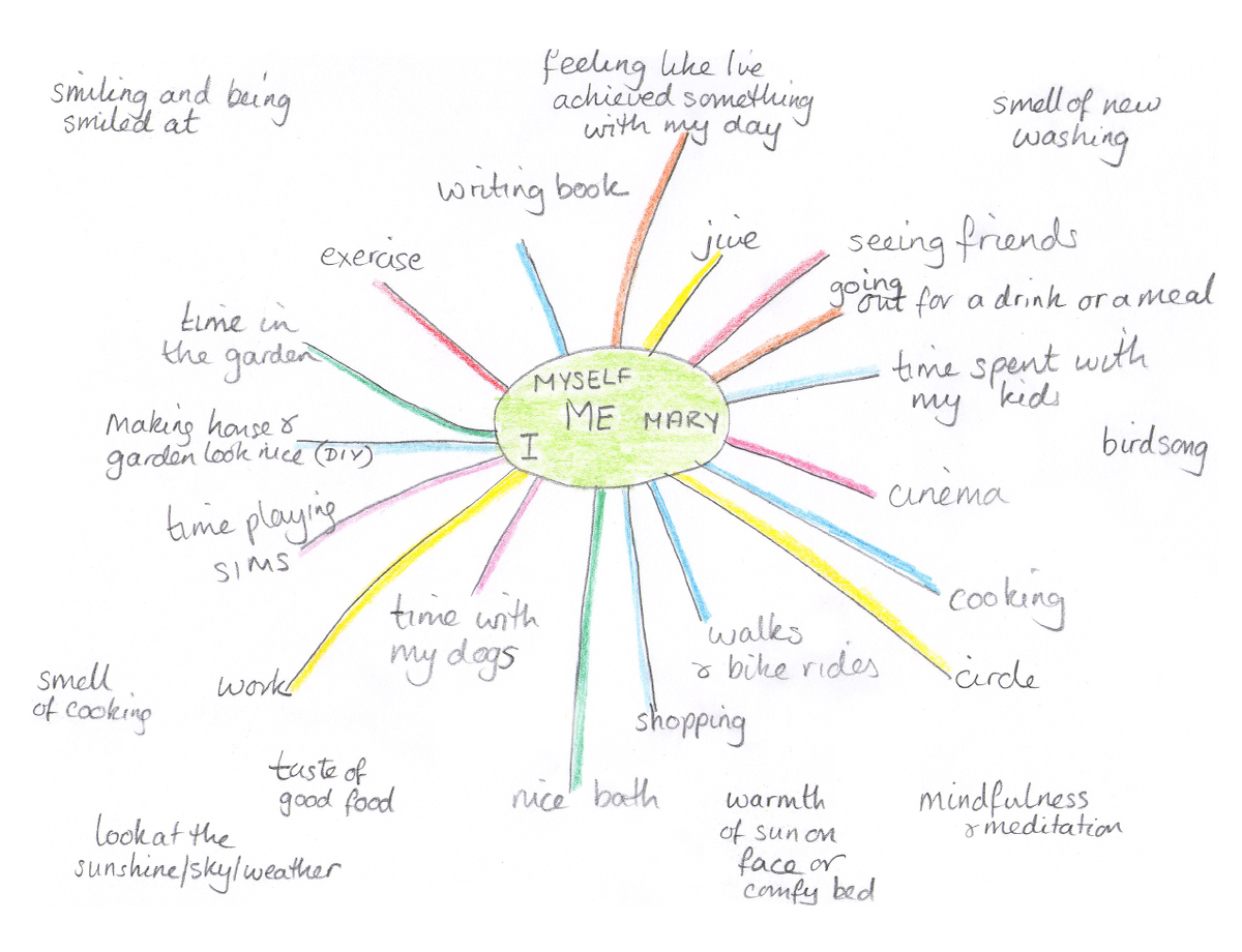 The following exercise was just one of many which helped me to see the many things that are important in my life and to re-focus, rather than being caught in the persistent cycle of panic and dread of the future.