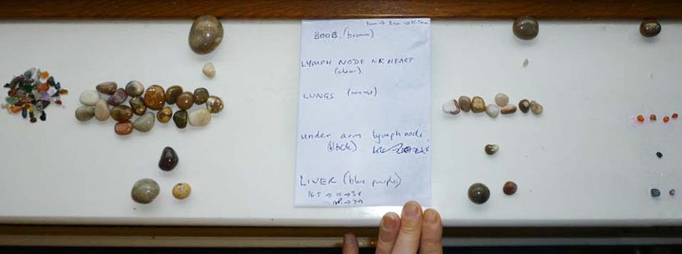 I was desperate to visualize my tumours in order to give myself the best chance of fighting them with my mental battle. One evening I discovered that the stones would make good representations of them. I could choose from all the sizes and I felt my mother’s presence when I chose each stone to represent each single tumour, and the handful of smaller ones to represent what looked like a plate of peas in my right upper lung.